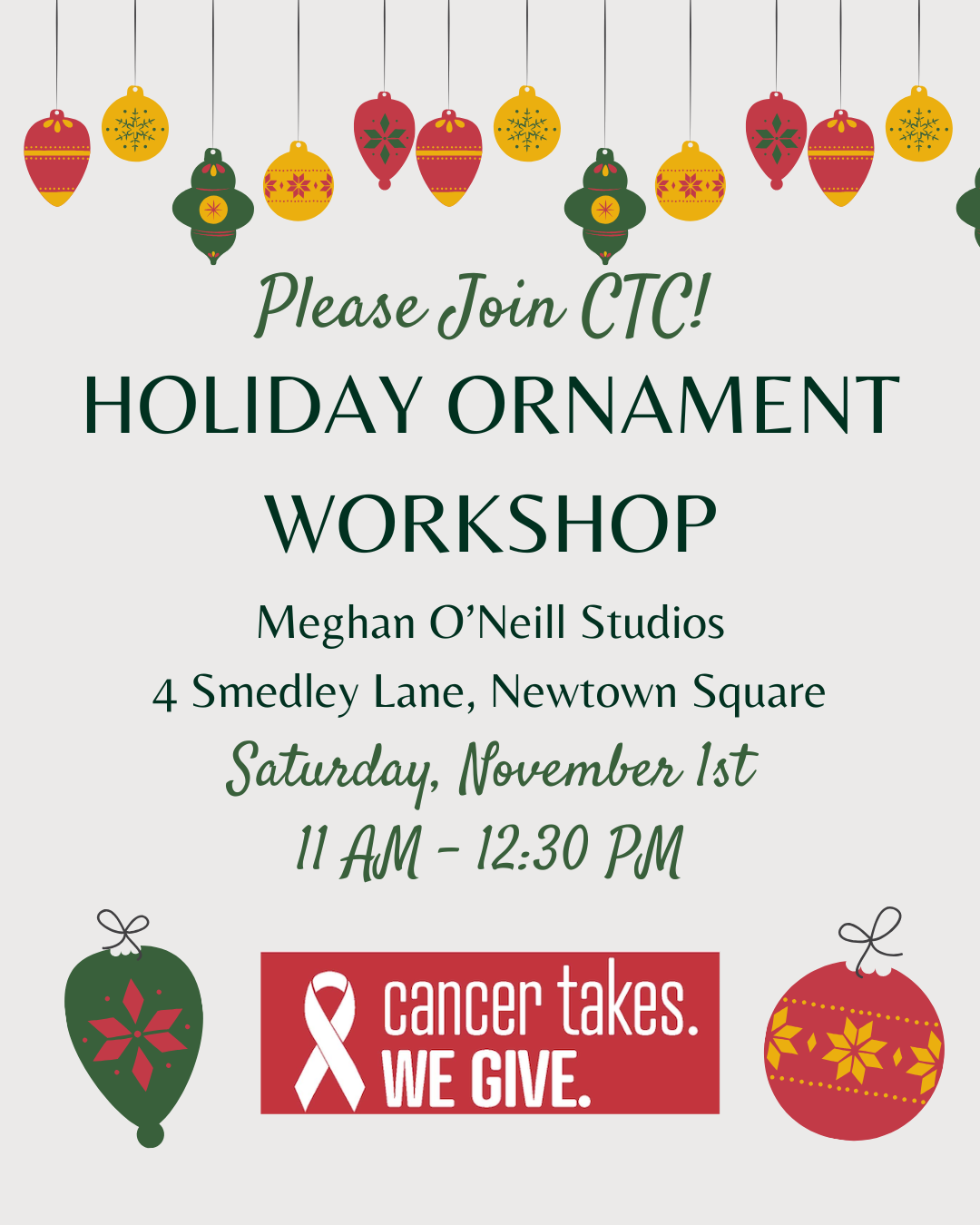 Join us on Saturday, November 1st for a Holiday Ornament Making workshop at Meghan O’Neill Studios in Newtown Square. We will come together to make beautiful custom ornaments perfect for decorating your home or giving as a memorable gift! Space is limited and registration is required so save your spot today!